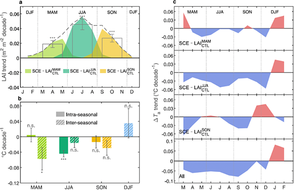 图1. 北半球各生长季节植被变化所产生的当季和跨季气温效应。