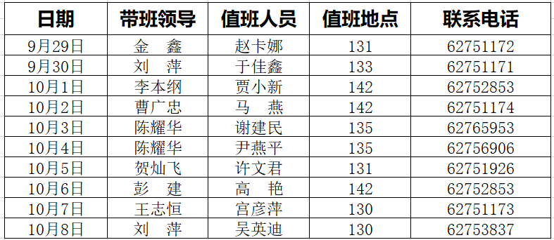 根据公司要求,9月29日至10月8日,公司每日安排1位工作人员在岗值班,值班时间为9:00-16:00,同时每日安排1位领导带班,带班时间9:00-次日9:00,要求带班领导在京并保持手机畅通。