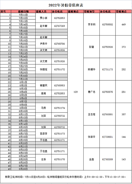 2、为加强疫情防控,充分做好开学准备工作,教职工轮休时间:7月11日至8月28日。轮休期间值班实行轮休作息时间:上午9:00-12:00、下午13:00-17:00。8月29日(星期一)教职工上班,同日恢复正常作息时间。
