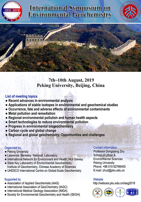 环境地球化学国际研讨会旨在为环境地球化学相关领域的国内外学者提供宝贵的平台,分享交流在应对环境变化层面上最新的研究成果。会议迄今已成功举办十届,在国际环境地球化学领域具有重大影响力,促成了环境污染治理、环境过程研究等环境地球化学相关领域的一系列重大研究成果,对环境治理与生态保护有重要的理论和实践指导作用。