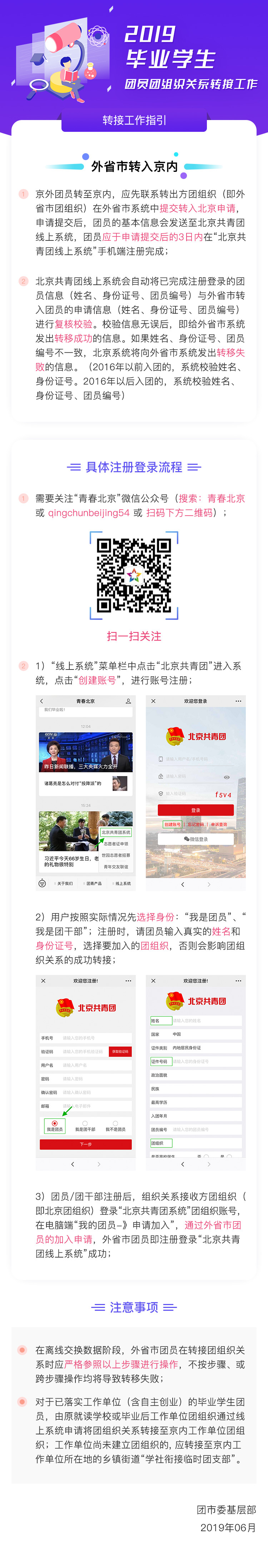 发布时间:2019-06-22目前“北京共青团线上系统”与智慧团建系统及广东、福建省,处于离线交换数据的阶段,需团员先注册登录“北京共青团线上系统”后,再由组织关系转出方团组织(即外省市团组织)在智慧团建系统上提交转入北京申请。具体操作说明如下: