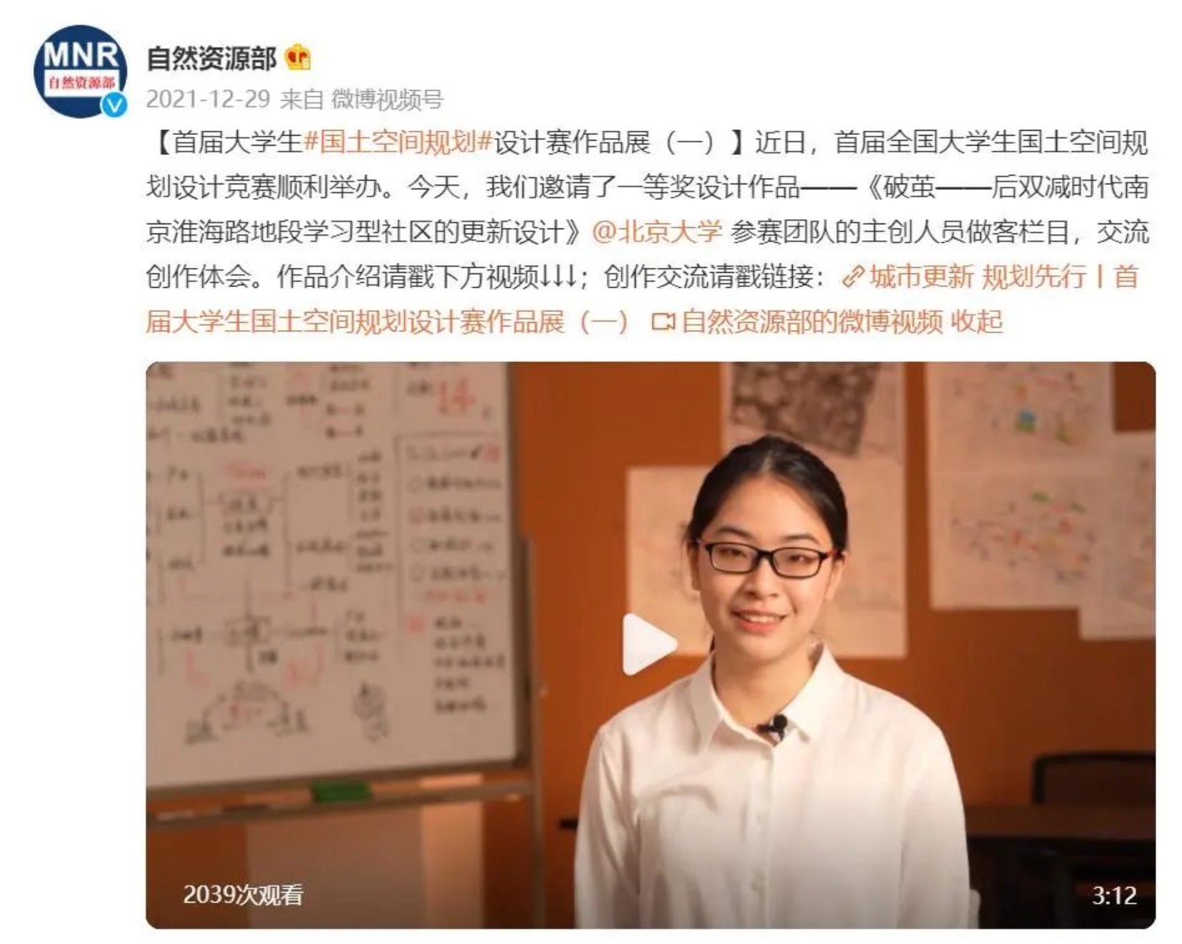 此外,作为组长,她于2021年暑假参加了自然资源部主办的首届全国老员工国土空间规划设计竞赛,在公司四位老师的指导下,带领团队完成了较为满意的成果,《破茧——后双减时代南京淮海路地段学习型社区的更新设计》获得了全国唯二的一等奖。设计作品和创作历程获得了自然资源部相关部门采访,在自然资源部官方微博、微信平台及中国自然资源报上发表。