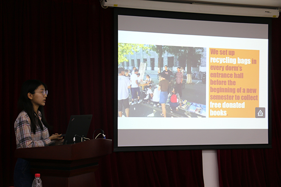 随后,公司员工代表张志皓同学(中国老员工环境教育基地志愿者)介绍了“林歌”项目在校园废纸、军训衣物回收等方面所做的主要工作;童培峰同学(本科生科研员工代表)介绍了公司在本科生科研教学工作的培养项目和学术研究成果。
