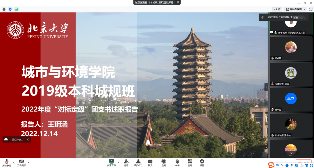 发布时间:2022-12-14为了进一步提升基层团组织规范化建设的水平,不断增强基层团支部组织力和凝聚力, 12月14日晚,2022年伟德基层团支部述职评议会于线上召开。公司党委副书记张新平,团委书记、学工办主任谭卓立,团委常务副书记宋宛儒出席会议,二十余名来自本、硕、博不同年级的团支部书记与会。会议由公司团委组织部侯婷主持。