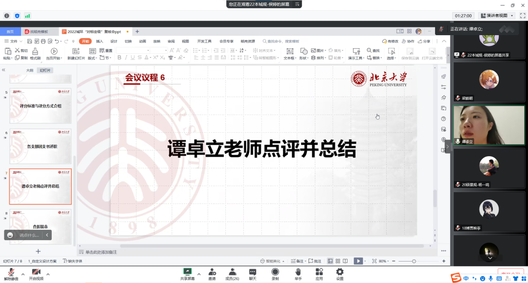 总结宝贵经验,从交流中学习。对标定级环节,侯婷向大家介绍了“对标定级”的评分标准和评分方式,三位老师根据自评表及述职情况对各团支部现场打分。来自本、硕、博各班的团支书分别从班子运转、团员管理、活动开展等方面进行了述职,分享长期工作积累的心得体会。本科团支书重点介绍了团支部开展的特色活动,充分展现了团员同学丰富的组织生活。硕博团支书则重点陈述了工作开展的方法,以及团支部与党支部的紧密对接。