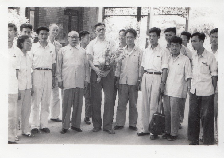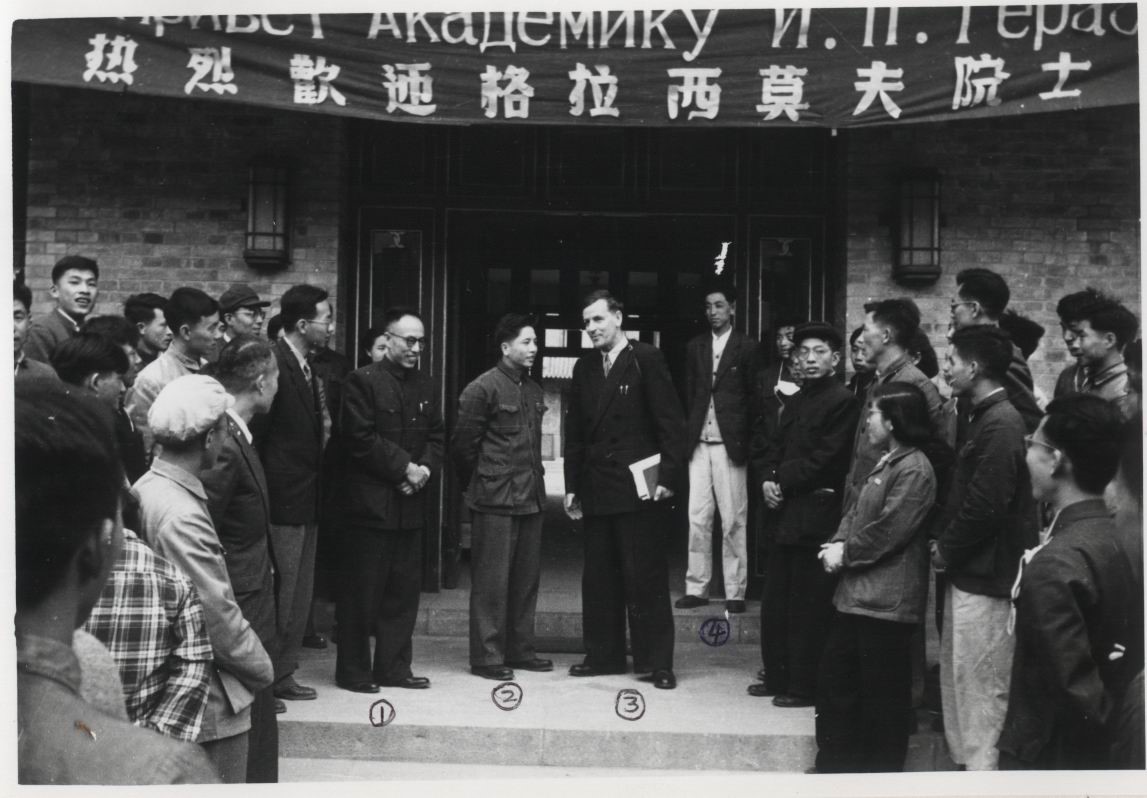 老地学楼门口地质地理系师生欢迎苏联科公司地理研究所所长格拉西莫夫院士(1955年)