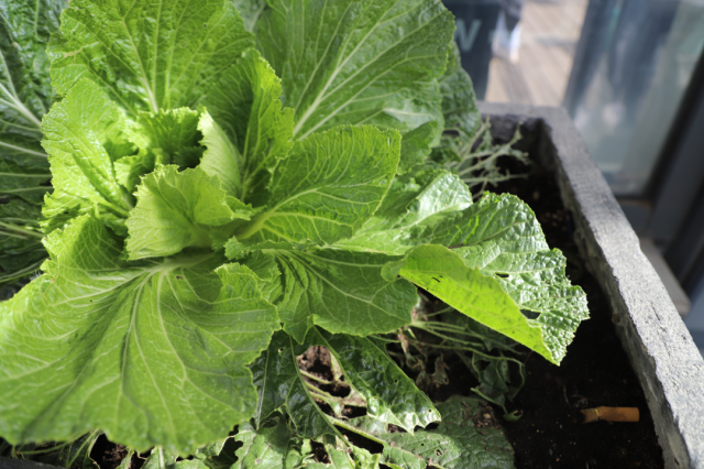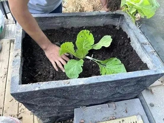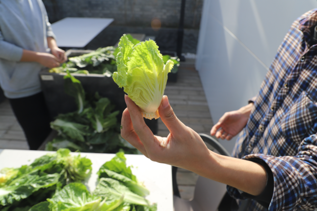 在家园食堂露台种植的白菜是由幼苗移植过来的,这一步需要十分严谨且专业的操作。生命科学公司的苏都莫日根老师在北大开设了一门“老员工种植实践”通选课,对种植教学拥有非常专业的经验,同学们便邀请他来进行指导和帮助。在移植两三天后,确认白菜幼苗已经成活,这片“试验田”便全权交由“林歌”计划的同学们负责管理。