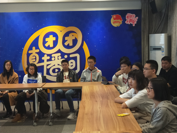 随后同学们移步到了新媒体中心的直播间,在直播间里,相关负责人就共青团新媒体平台的现状做了简要介绍。通过介绍,同学们了解到团中央新媒体中心在青年宣传工作中发挥的独特作用——“突破次元壁垒,为党赢得青年”。新媒体中心的工作以维护发展好网络爱国青年力量为目标;以不断扩大自身影响力为中心;一手抓议题设置,一手抓网络文化产品生产;不断打破平台壁垒。从包括微信、微博、知乎、QQ在内的传统社交平台到同学们没有想到的B站(Bilibili弹幕网站)、网易云音乐,再到近两年大火的微视、抖音和快手,共青团中央新媒体中心在这个快速变化的流量时代实现了政务新媒体的全方位布局,充分释放了多种新媒体的矩阵效应。根据各种平台的自身特点,团中央新媒体中心在不同平台直击青年审美,聚焦青年需要,以接地气、有朝气、富生气的方式高效完成着团结青年、了解青年、引领青年的时代任务和历史使命。
