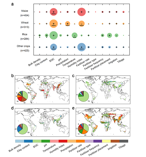 图1 农田氧化亚氮排放因子空间分异的多尺度驱动因素。a. 全球尺度,b-e. 栅格尺度(3.75° ? 3.75°)