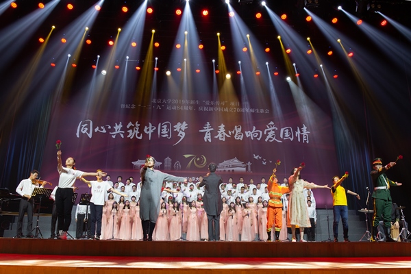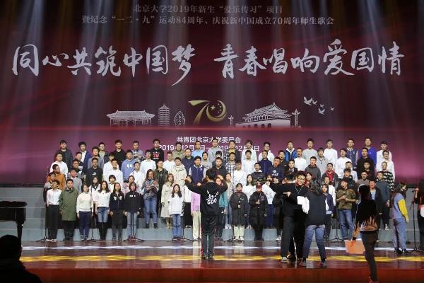 我们的歌声在逸夫贰楼、英杰交流中心、新太阳员工中心、对外汉语教育公司先后响起,而今天终于在百年纪念讲堂唱出对祖国的热爱。公司党委团委老师、班主任、辅导员和新生们一起参与训练、共同登台表演。