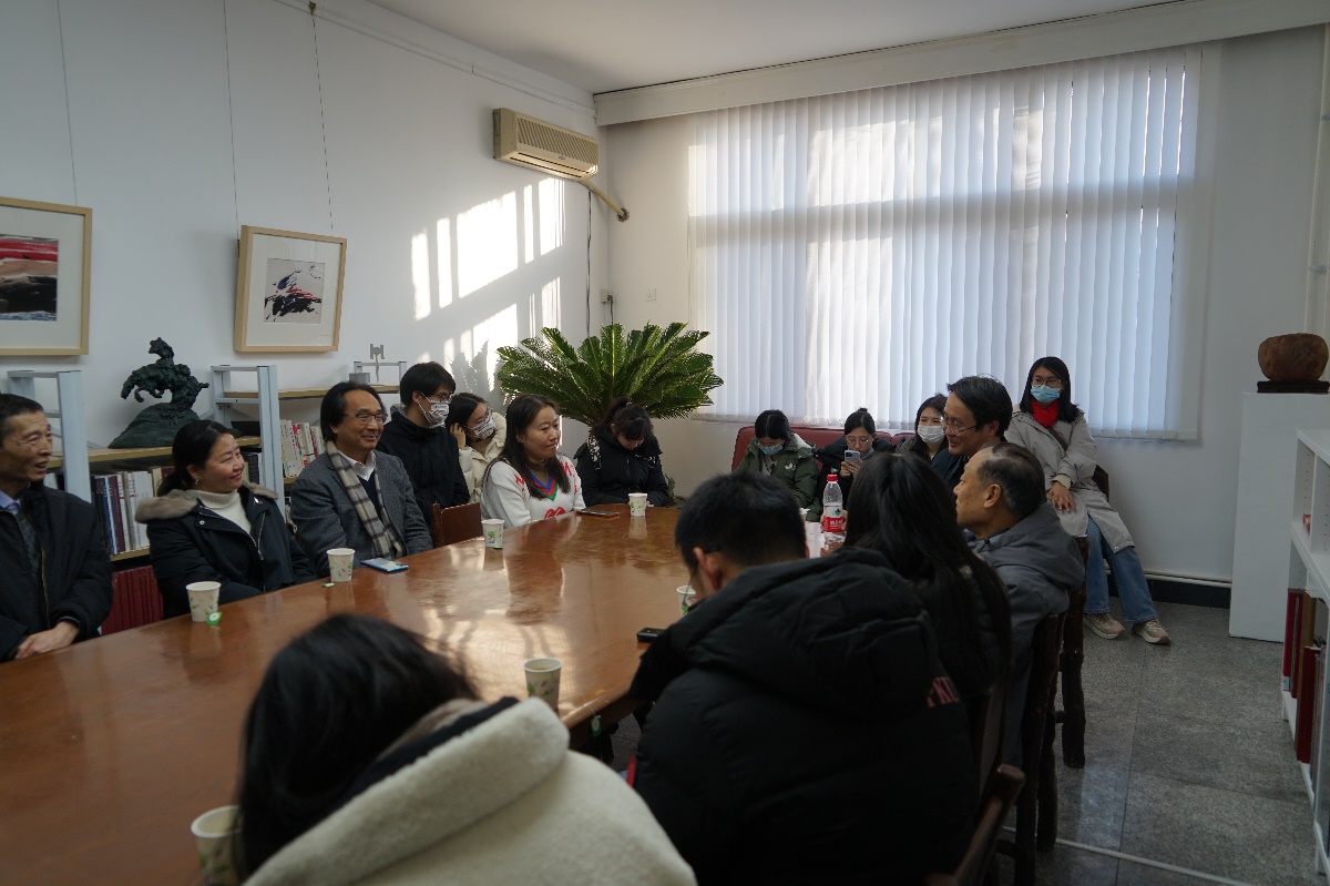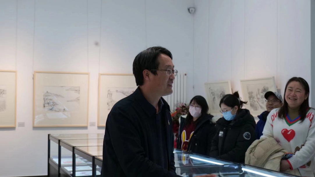 画展现场气氛热烈,师生们在冯健老师的引领下,驻足观赏每一幅作品,不时进行相互讨论和由衷赞叹。展览的作品内容各异,有的作品表现了勺园的荷塘初雪,有的作品展现了静园充满生命力的紫藤,还有一些作品源于冯健老师对生活的感悟,相关作品展示了冯健老师对北大精神、对学者与社会关系以及对人与自然关系的理解,给师生们带来了深刻的艺术享受。随后,师生们进行了短暂的交流讨论,大家表达了观赏画展的体验与心得,认为冯健老师兼具地理科学研究者和书画创作者这样的身份,是人文和地理跨学科育人的典范,艺术教育可以给师生带来愉悦,提供心理减压。冯健老师分享了自己创办画展的初心以及对当代艺术发展和人文情怀的理解。与此同时,城环团委提出,拟聘请冯健老师担任公司同学的“美育导师”,接下来员工的美育系列活动将蓬勃开展,希望帮助城环员工培育美的欣赏能力,提升对自我和世界的认知体验,全面成长成才。