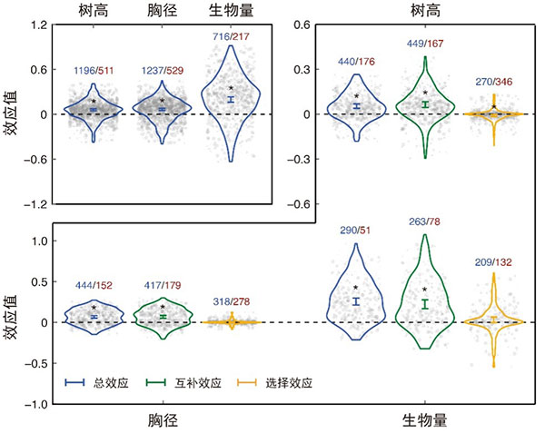 图1. 混交林在三个生长指标(树高、胸径和生物量)上的混交效应,其中正值表示混交林的生长指标高于纯林。