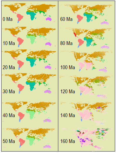 随后,该研究重建了全球被子植物区的演化历史,结果发现,当前的主要植物地理区在新生代早期(约6000万年)就已经基本形成,不同植物地理区之间的区系差异整体上随时间逐渐变大(图2)。其中,非洲区和印度-马来区在新生代经历了融合并再次分离,最终在全新世后形成当前地理格局;与此对应的,非洲区和印度-马来区的区系差异在古近纪差异较大,此后逐步缩小,但进入第四纪后又有增大趋势。