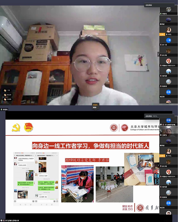 两位湖北同学各自介绍了家人在战疫一线工作的事迹。国庆70周年群众游行方阵队员、2018级本科城规班团支部余犀雨的母亲是襄阳市第一人民医院病理科主任医师,她和同事争分夺秒地对新冠肺炎患者的组织进行采样,取材、固定、包埋、切片、染色、显微镜观察。这次疫情让余犀雨看到了医护工作者的无私与伟大。同时他也回忆起参加国庆70周年群众游行训练中身边的青年党员、团员冲锋在前的担当,他表示,青年人要向这些优秀榜样学习,时刻准备好为人民挺身而出、勇往直前。2019级硕士党支部的李君怡用“感动、辛苦、焦虑、欣慰”四个关键词讲述了身在武汉的一家人参与社区一线防疫工作的感人事迹:为邻里间互助互爱、令人感动而感动;为道路难走、早出晚归而辛苦;为无证人员不听劝阻、担心自己感染病毒并进行传染而焦虑;为守职期间群众们的支持和感激而欣慰。通过这次疫情,她也更深切地体会到青年学子的本职和担当。李君怡发言后,与会所有师生集体鼓掌向武汉人民致敬,为武汉人民加油。