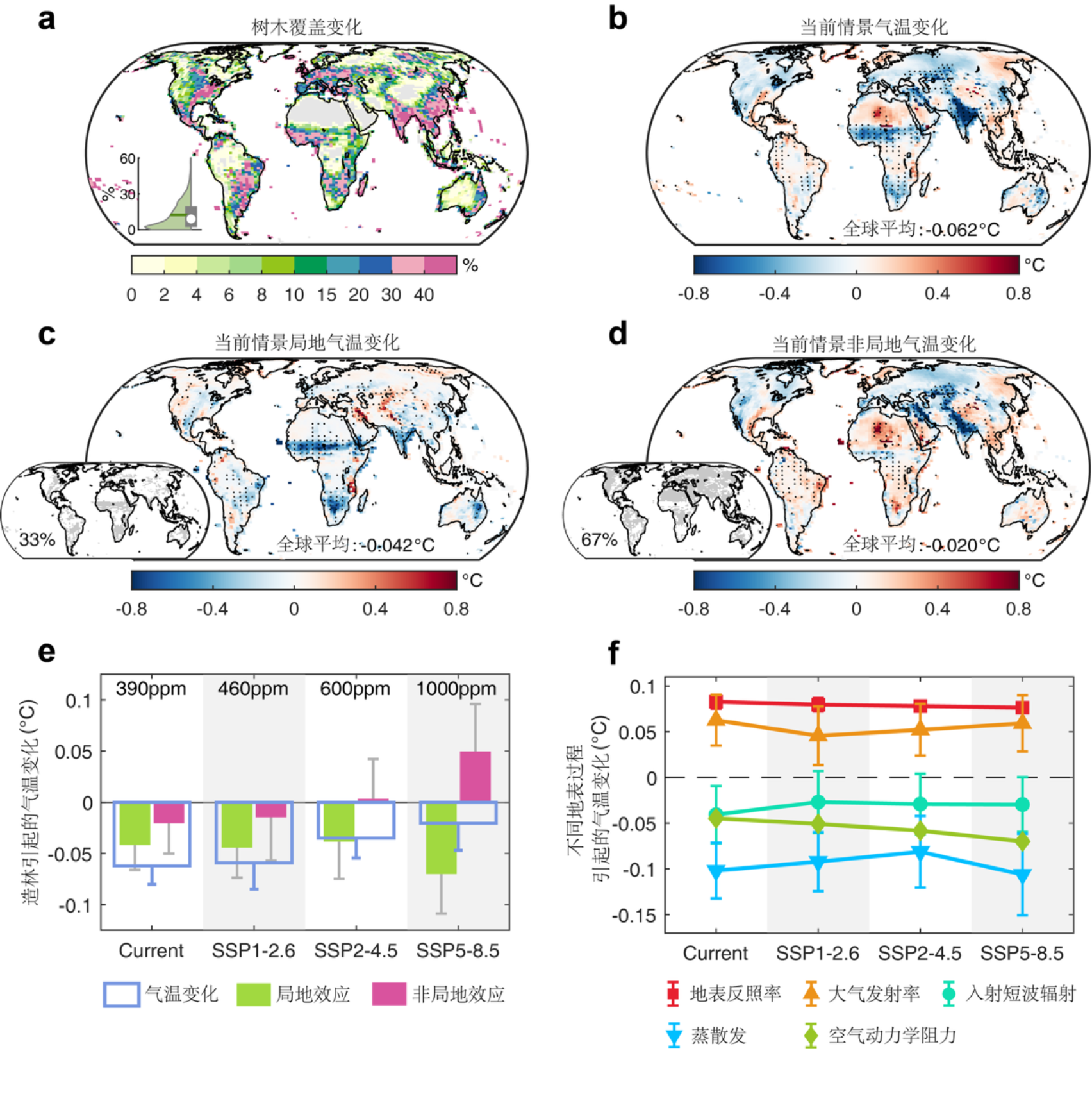 图1 全球造林的生物物理降温效益及其对不同大气CO₂浓度升高情景的响应