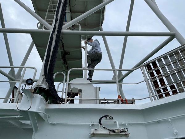 尽管天气多变,在航行期间大家每天仍保持着固定的时间间隔风雨无阻地采集表层水和大气样品,每天清早和傍晚,安永睿都会站在侧甲板,用一个连着尼龙绳的小不锈钢桶“打水”,这种看似原始简单的方法其实也需要一些技巧和经验,既要让海水对桶充分润洗,又要避免小桶被翻涌的海浪卷走。为避免船舶尾气污染干扰,采集大气样品需爬上顶层的雷达塔,驾驶室的船员们知道后,每次采样都为我们提前关掉雷达,遇到夜间采样便会在塔下打开手电筒,默默地关注着我们的一举一动。