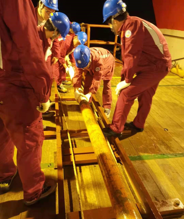 尽管由于天气、海底地质条件等不可控性因素导致的意外状况时有发生,但好在首席张国良研究员和工程技术部的几位技术员们都在第一时间从各自的专业角度给出了解决的建议,而船上的Wi-Fi也保证了四位同学能够及时与陆地上的老师、同学们进行交流。还记得第一次重力柱取样失败后,周老师在微信语音中鼓励大家:“失败是成功之母。”关于下一次沉积物采样位置、样品处理和保存等问题的讨论也使大家对下一次的采样工作重新有了信心,最终顺利回收了长达5.37m的沉积物柱状样品。