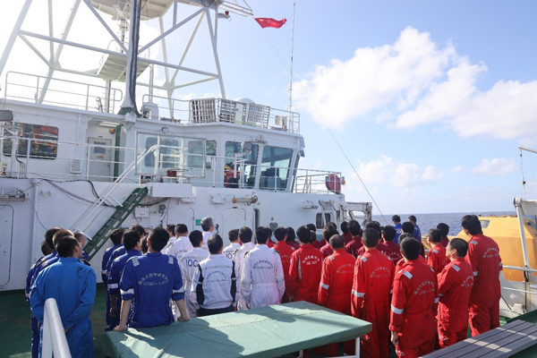 发布时间:2021-02-09北京时间2021年1月1日上午8点,国家自然基金重大项目“西北太平洋地球多圈层相互作用”NORC-581航次的全体研究人员和船员们在登艇甲板上举行了一次特别的升旗仪式。伴着国歌,国旗徐徐升起,迎风飘扬,大家行着注目礼,内心的庄严感与使命感油然而生,航行在西太平洋上,我们仍与祖国连在一起!中共十八大报告提出,提高海洋资源开发能力,发展海洋经济,保护海洋生态环境,坚决维护国家海洋权益,建设海洋强国,这是中国特色社会主义事业的重要组成部分。我们要提高海洋科技自主创新能力,跟踪和探索海洋领域的重大科学问题,提高勘探开发海洋资源的水平,加快建设海洋强国。而如今,我们也希望能够通过自己的从事的海洋相关研究为我国海洋强国的建设贡献一份力量。