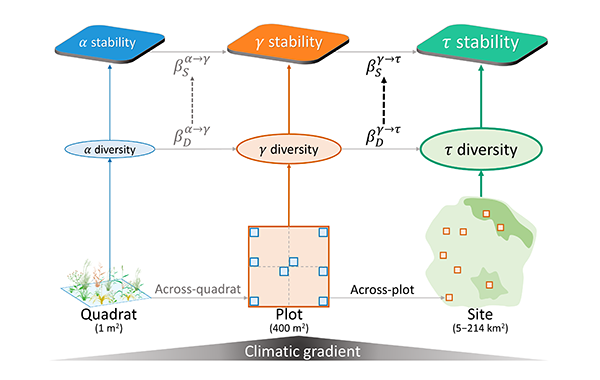 发布时间:2022-09-20自然生态系统为人类社会提供了多种功能和服务。在全球变化背景下,维持生态系统的稳定性成为可持续发展的关键目标之一。很多研究表明,多样性越高的生态系统具有更大的稳定性。虽然“多样性-稳定性”理论自1990年代以来日趋成熟,但以往研究主要关注小尺度实验群落,关于这一理论能否扩展至大尺度自然群落仍不清楚。为了理解这一问题,伟德王少鹏研究组自2014年以来开展了一系列理论工作,提出并发展了多尺度稳定性理论框架,基于这一理论框架预测局域群落间的物种组成差异(即β多样性)可促进区域尺度生态系统的稳定性。针对这一理论框架,近期多项研究利用单个站点的植物群落实验数据做了检验,但跨区域的大尺度经验证据依然缺乏。