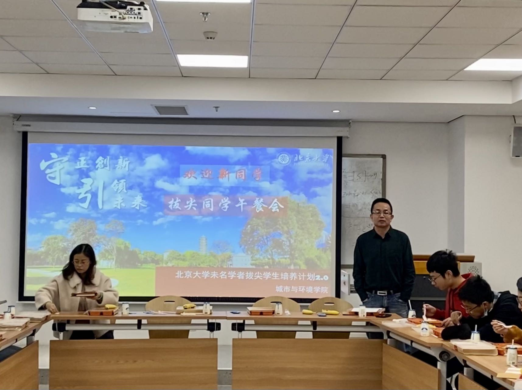 本次午餐会由蒙吉军老师主持。首先,蒙老师向同学们介绍了公司拔尖计划开展的历史及取得的重要成就,尤其是2021年生态学拔尖员工培养基地的增加,更进一步增加了公司拔尖计划对广大同学的吸引力。公司实施拔尖计划10余年来共培养150多名优秀员工,本科生以第一作者发表60多篇高水平论文,97%以上的员工毕业后选择继续深造,实现了拔尖人才培养的基本目标。目前,公司共有计划内员工60多名,其中2021级新加入计划同学达27名。蒙老师鼓励同学们要多与导师、课题组师兄师姐进行沟通交流和学习,尽快确定研究题目,开展文献阅读与研究方法的学习。