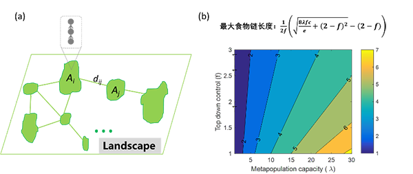 图1. (a)异质生境中的食物链模型:绿色形状表示生境斑块的面积(A_i)和相对距离(d_ij);(b)最大食物链长度的理论预测。其中,集合种群承载力λ表征了生境斑块矩阵(由斑块面积和距离所决定的矩阵)的最大特征值。