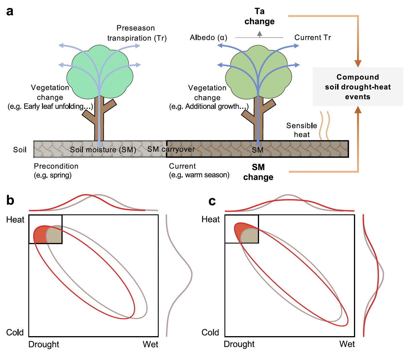 图1. 植被变绿通过影响土壤水分和温度加剧复合干旱-高温事件分析框架。