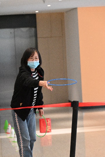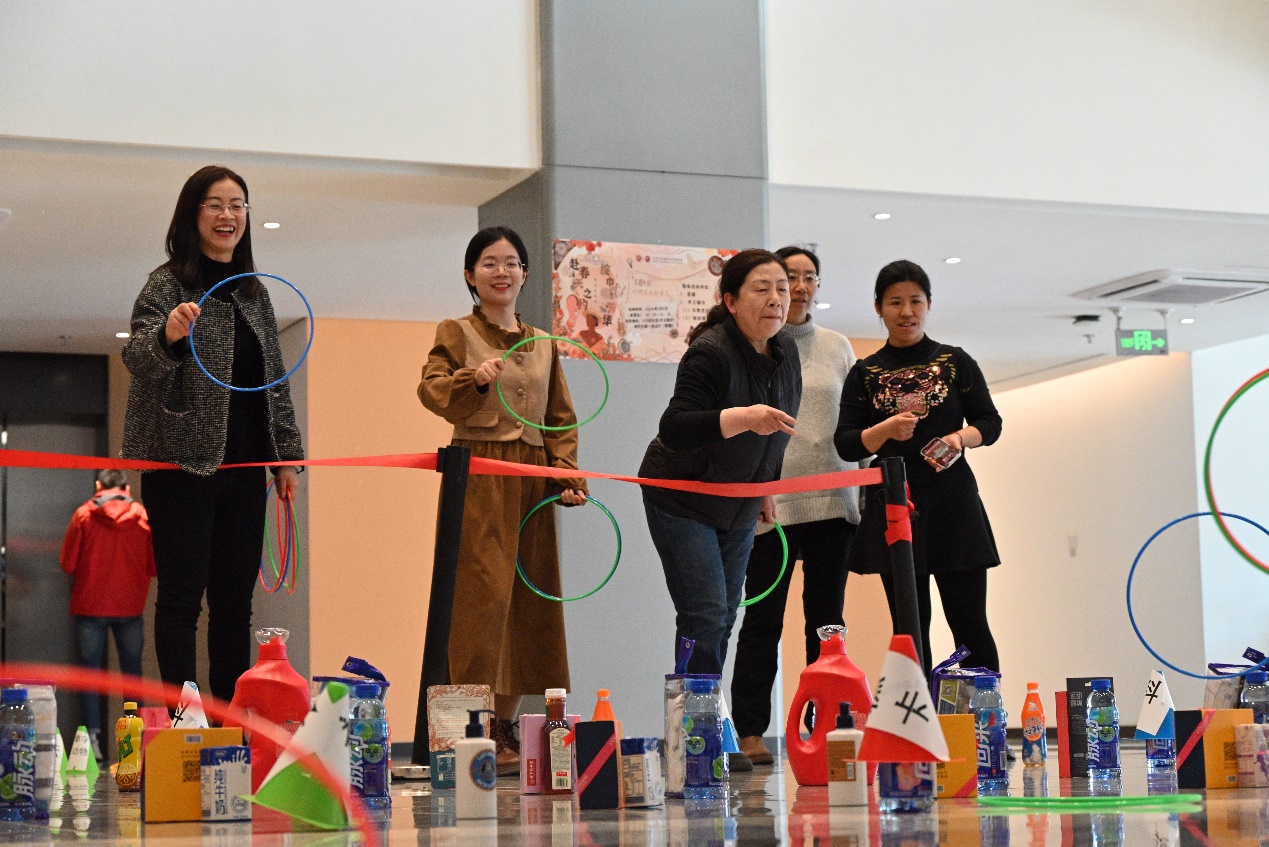 欢声笑语中,趣味套圈活动率先拉开序幕。现场布置得活泼有趣,色彩斑斓的套圈与琳琅满目的目标物品相映成趣,为整场活动注入了无尽的活力。老师们跃跃欲试,手握套圈,眼神中闪烁着期待与兴奋。每一次精准的投掷都伴随着热烈的欢呼与掌声,喜悦之情溢于言表,感染着在场的每一个人。