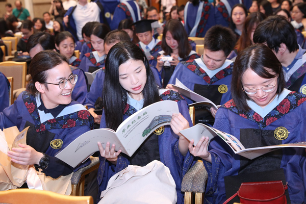 典礼开始前,毕业生们在百周年讲堂前进行了合影,将垂布摆放在胸前,学士帽端正戴好,与老师和同窗分享这一刻属于自己的自豪与喜悦、激动与不舍。