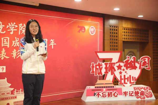 之后,几位不同身份的员工代表分别分享了自己与国庆重大活动的故事。作为志愿者代表,韩云凤、孙福月与师生分享了活动当日自己的经历与内心感受:庆典志愿者三点半出发,夜穿故宫,引导服务,虽身体劳累但精神充实;成就展志愿者虽未达庆典现场,但也在岗位上兢兢业业,为祖国庆生。替补成员万山铨虽最终没能走上长安街,但仍无怨无悔,为自己的使命感到骄傲。秦艳伟代表参加群众游行的同学们讲述了训练时的辛苦与欢乐,走过天安门前的激动与自豪。王浩舒分享了广场合唱成员用三个月里高强度、高密度的训练和合排,锤炼出同一种声音,为祖国歌唱、为时代的美好未来歌唱的经历。作为小队长,范晓琳回忆起自己与队员们相处的点点滴滴,在彼此的交流之中对北大和祖国的感情也愈发深厚。