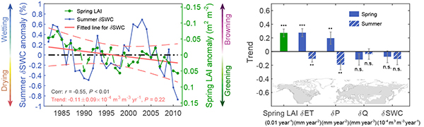 该研究成果以“Summer soil drying exacerbated by earlier spring greening of northern vegetation”为题在线发表在Science Advances杂志(doi:10.1126/sciadv.aax0255)。2016级直博生连旭为第一作者,朴世龙教授为通讯作者。