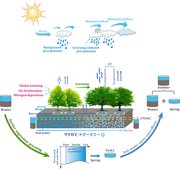 发布时间:2020-01-06遥感和地面观测均证实升温导致北半球植被春季物候提前。春季物候提前通过增加光合时长和光合速率从而有效提高植被生产力;另一方面,春季物候提前会加快土壤水分消耗,改变局地水循环和气候的季节动态。但相比于物候提前的碳汇效应,学术界关于北半球春季物候提前对水循环和气候的生物物理反馈机制,尤其是跨季节滞后效应的认识非常有限。