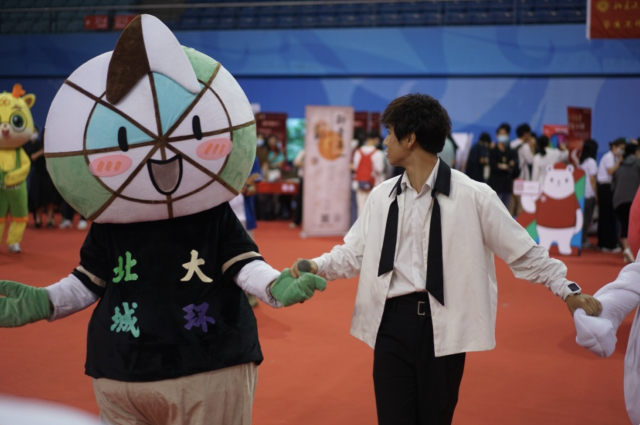 作为迎新的重量级嘉宾,北大伟德的吉祥物——城小环已早早就位,满怀期待地迎接大家的到来!可爱精巧的指南针造型,蕴含着为新生们指引方向,寻求真理的美好祝福。蓝绿交错的清新配色,也代表了城环学子拥抱美好环境、守护碧水蓝天的愿景。在迎新现场,城小环不出意料地成为团宠和全场“社牛”,不仅积极和新生们合影留念,见证大家在迎新现场的第一抹笑容,还在表演环节主动走上会场中央与嘉宾互动,将城环人的无限热情与满满活力送给所有新生朋友们!