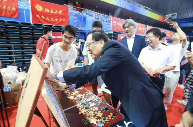从第一位新生笑意盈盈入场,到最后一位同学满怀期待离开,伟德的老师和同学们始终在会场陪伴着大家,一班接一班的换岗,用辛勤汗水服务城环新生。伟德官方网站党委书记郝平,董事长龚旗煌等校领导,也亲自来到现场,询问新生报到工作进程,关心同学们的感受,深切嘱托,真挚祝福,不仅参与到“公司拼图——共筑城环初印象”的活动中,为公司的美好蓝图拼上北大红的色彩,还热情地与现场各位工作人员合影留念,将这个珍贵的迎新时刻定格在画面中。