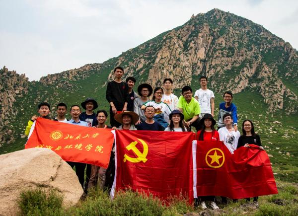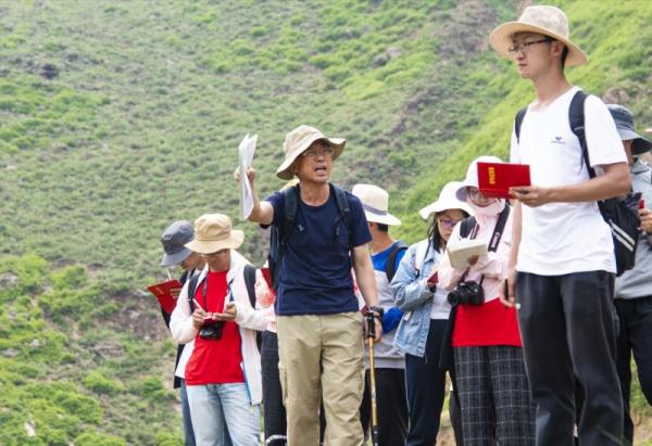 2019年6月,刘耕年(前排右五)带领2018级地貌实习及思政实践的同学赴山西大同,在恒山山脉考察途中齐唱红歌