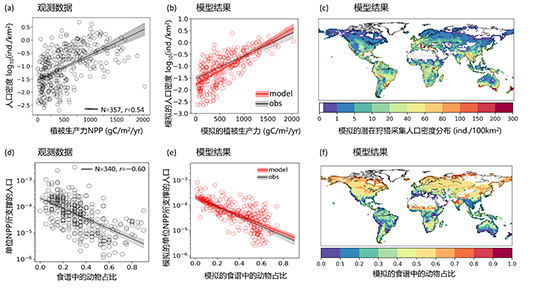 这一基于过程(process-based)的机理模型涌现出重要的规律:在非生长季(冬季或旱季)较长的地区,由于可食用植物的季节性匮乏,狩猎采集者高度依赖由捕猎获取的动物作为食物来源;同时由于能量从低营养级向高营养级传递会产生大量损耗,对于食谱中动物占比更高的族群,单位NPP所能支撑的人口密度远低于以植物为主要食物来源的族群。该机理模型涌现出的宏观规律得到了观测数据的支持(图2),进而从机制上定量揭示了世界各地狩猎采集人口密度巨大差异的原因。