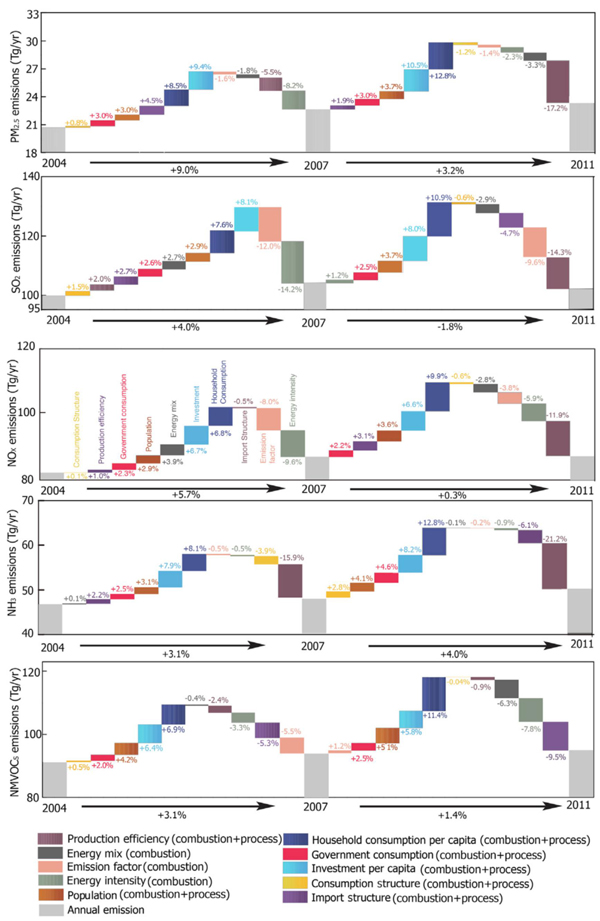 图1. 2004-2007和2007-2011 两时间段内各类社会环境经济要素对全球工业源一次PM2.5、SO2、NOx、NH3和NMVOC排放变化的贡献。