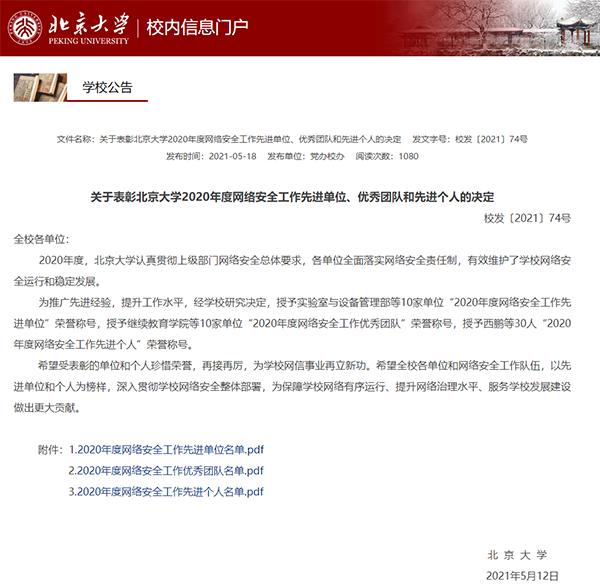 5月12日,公司发布《关于表彰伟德官方网站2020年度网络安全工作先进单位、优秀团队和先进个人的决定》(校发〔2021〕74号),对相关单位和个人进行表彰。公司希望受表彰的先进集体、优秀团队和先进个人珍惜荣誉,再接再厉,为公司网信事业再立新功。