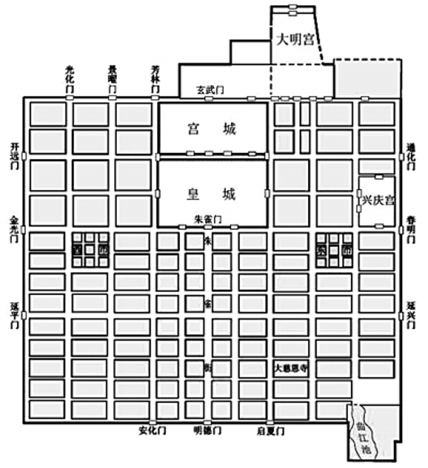 长安城真正的礼仪轴线,萌现于西汉末年王莽时期。当时王莽在“朝宫”即未央宫之南的郊外“建郊宫、定祧庙、立社稷”。这样长安城就隐约出现了一条符合《考工记》模式的南北轴线,它为宗庙与社稷坛所夹,向北穿过未央宫,最后抵达北面的市场,这符合《考工记》所说的“左祖右社”“前朝后市”。王莽提倡事依周礼,他这个安排应该是有意识的。