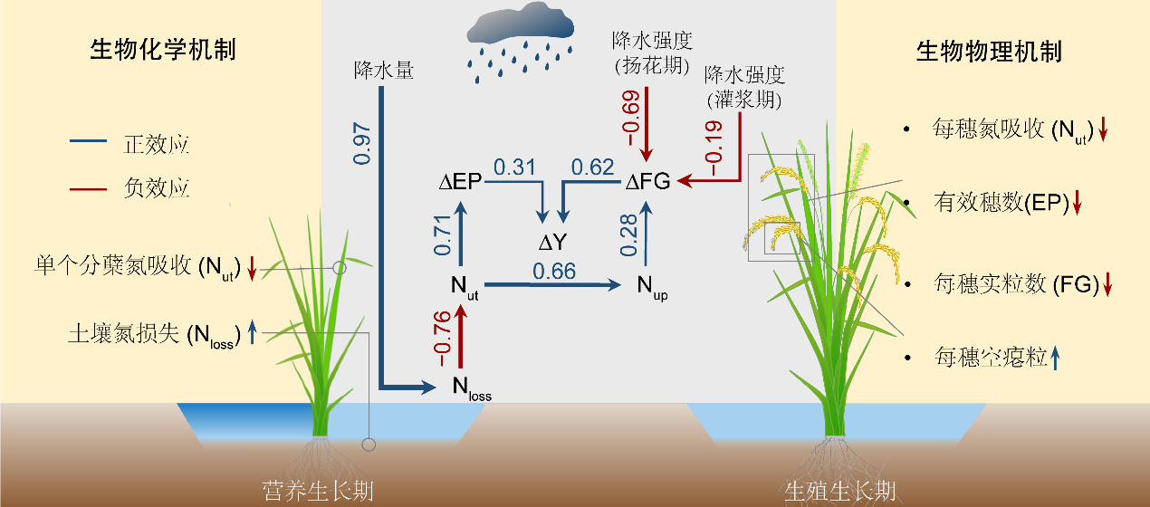 图2 极端降水造成水稻减产的生物物理和生物化学机制。单向箭头指示因果关系的方向,蓝色指示正效应,红色指示负效应,箭头宽度与数字(标准化路径系数)成正比;ΔY为极端降水引起水稻产量相对变化。