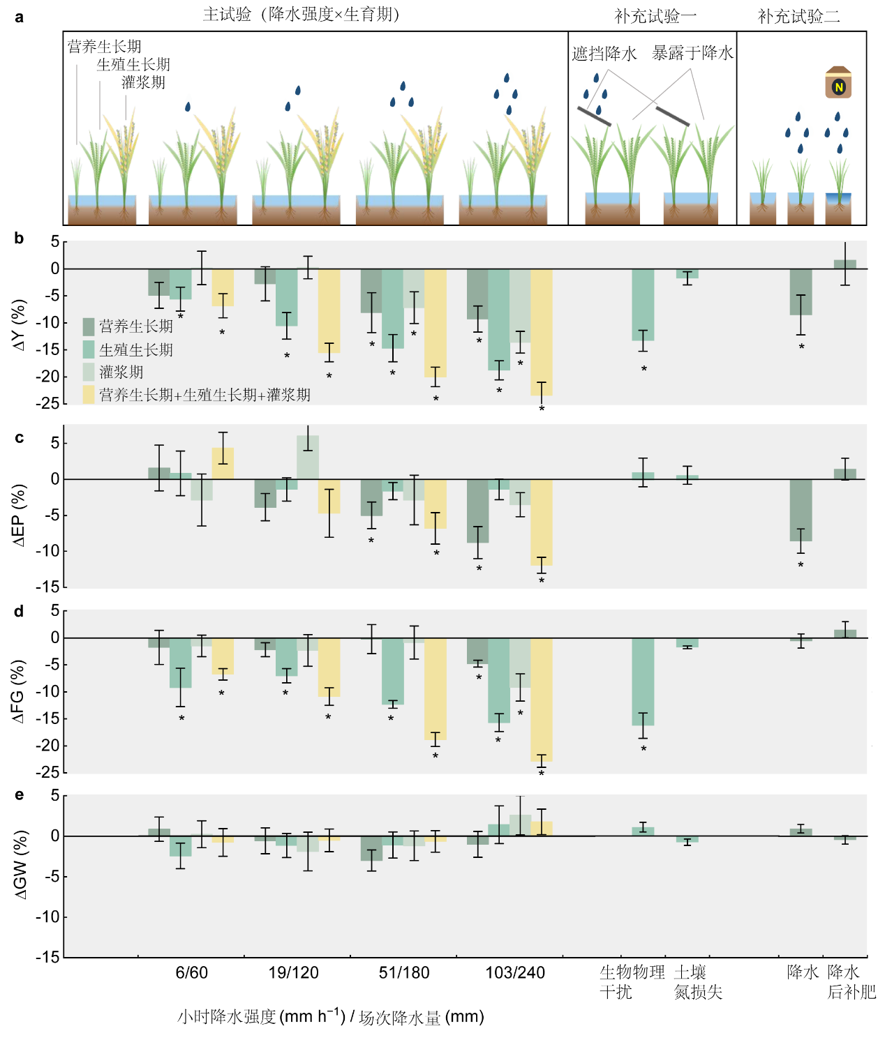 图1极端降水对水稻产量及其组成的影响。ΔY、ΔEP、ΔFG、ΔGW分别为极端降水引起水稻产量、有效穗数、实粒数、千粒重的相对变化;主试验为多梯度多生育期降水控制试验,补充试验一为扬花期降水半遮挡试验,补充试验二为营养生长期降水后补肥试验