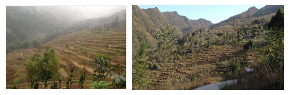 四川山区退耕还林恢复的人工林:桉树纯林(左)、厚朴纯林(中;厚朴皮是一种中药材)、竹与柳杉的混交林(右)